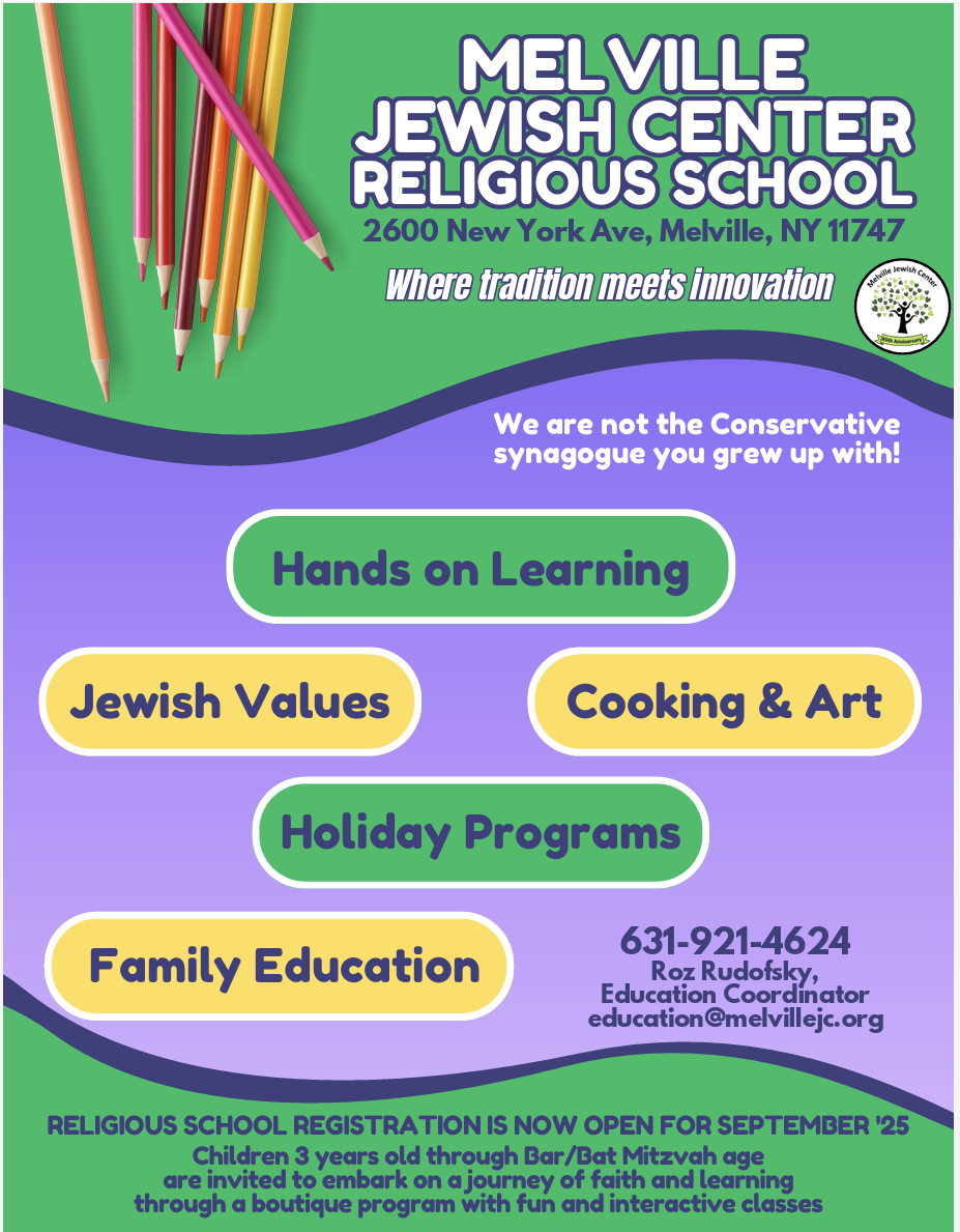 Welcome to Melville Jewish Center, an inclusive Conservative congregation. Here you will find a blend of traditional and progressive aspects of Judaism, engaging services and inspiring holiday celebrations, a deep connection to one another, and a commitment to Tikkun Olam (repairing the world). Together we joyously strengthen our Jewish bonds. We invite you to visit us and participate in our programs. We want to be the place you want to go!